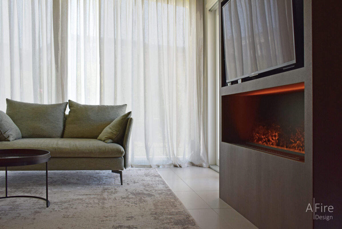简洁开放的起居室区域,别具一格的白色生态木吊顶设计,清新自然且健康环保,两张鼠尾草绿色织物软垫沙发和内置在电视柱上的电壁炉,增添了愉悦放松的气息。