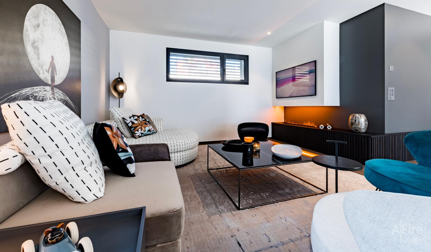 色彩点缀能够赋予空间与众不同的魅力,而家具和装饰品的细节和品质是塑造空间精致感的关键,也是主人个性与品位的展现。金属性质的壁炉、茶几和柔软的纺织沙发形成对比,一席空间同时容纳硬朗冷峻的质感和温馨柔软的体验,增添时尚科技的现代感气息,丰富了空间的层次感和质感。