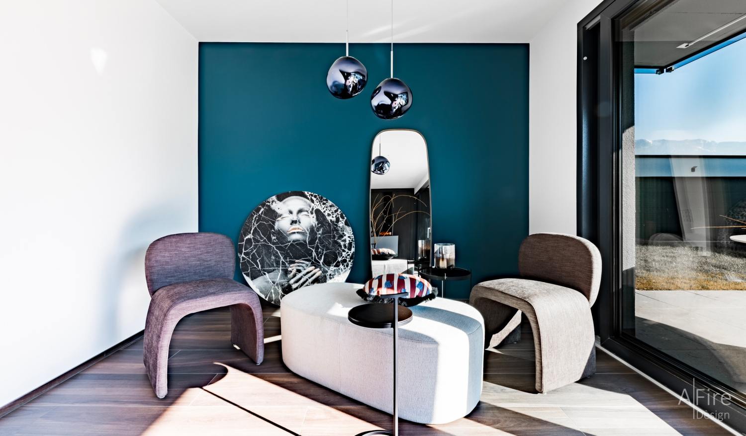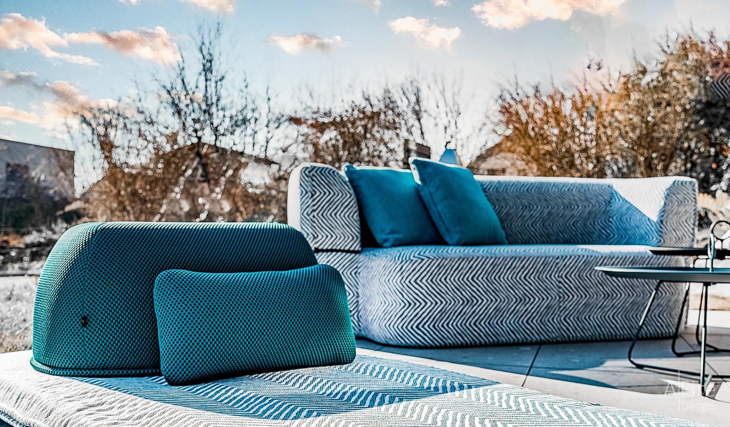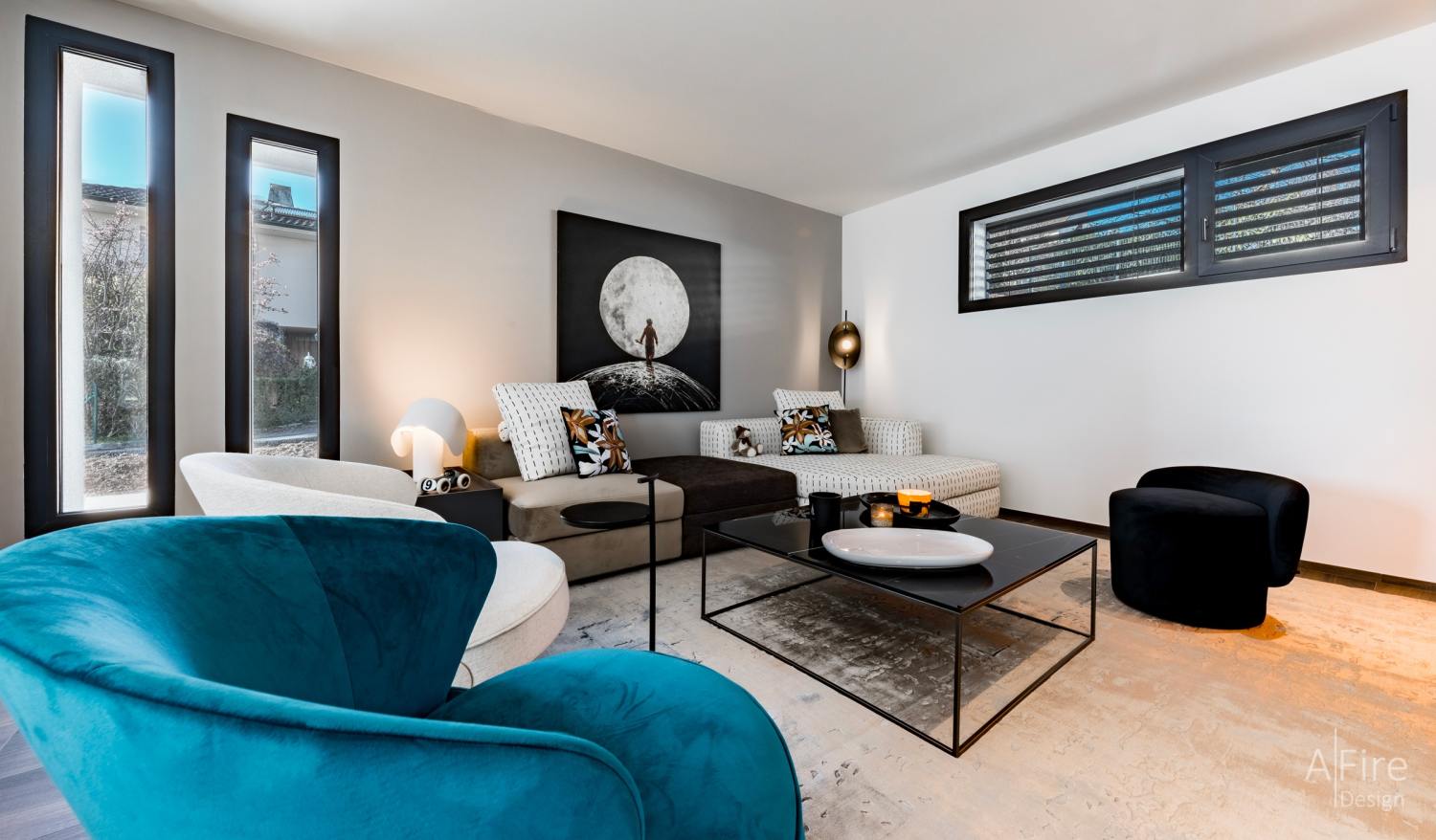 室内是轻奢世界,室外则是度假海洋。广阔的空间,自然的氛围,蓝色地毯与沙发仿佛天空和海洋的延伸,犹如踏上风情万种的地中海,人与自然的接触更亲密、更具象,让人情不自禁会用心感受大自然的馈赠,触碰生活的本真之美。
